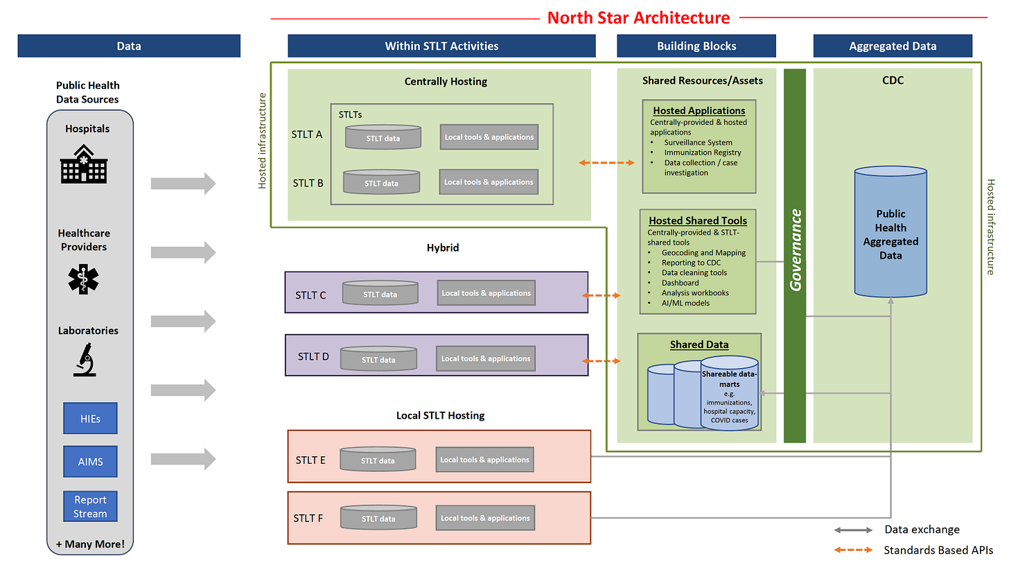 Locally Hosted EHRs consist of systems that presently dominate the healthcare information landscape; EHRs like Epic, Cerner and Athena. These are individual EHR instances (typically cloud hosted) that do not take advantage of the proposed ONC Building Blocks. Existing EHRs will, however, be required to share public health aggregated data with the Center for Disease Control and Prevention (CDC) much like a modern EHR / HIE (Health INformation Exchange) framework. The requirement to interoperate with the CDC by pushing USCDI+ (United States Core Data for Interoperability, enhanced consequent to the 21st Century Cures Act) data into the Public Health Aggregated Data repository, looks like back the future. Essentially, the CDC will take on the traditional HIE role and traditional EHRs like Epic and Cerner are required to play along - they must share USCDI+ data with the ONC, and, via the North Star Architecture, every other clinical entity authorized by the patient to access it.